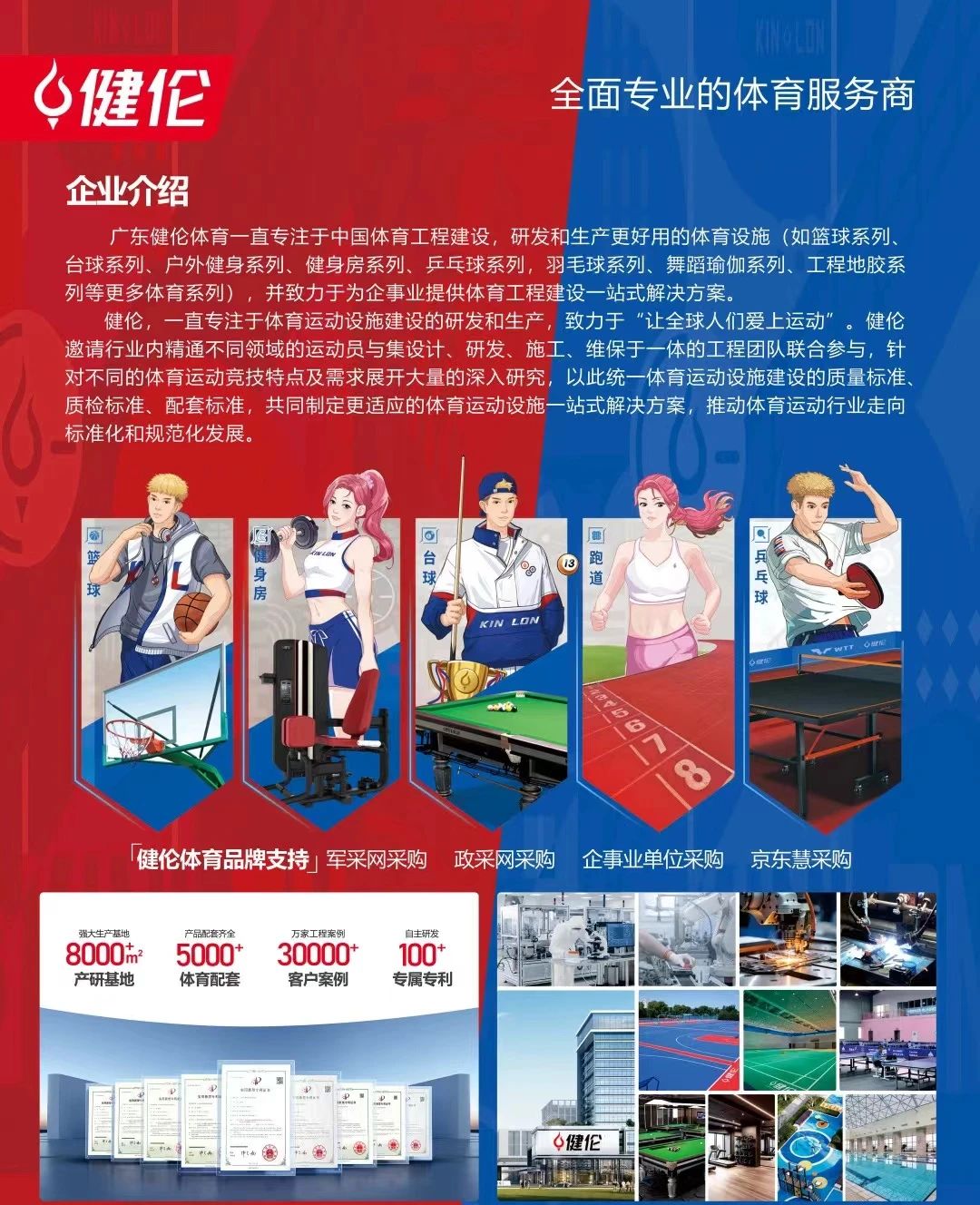 健倫體育位于廣東佛山,一直專注于健身運(yùn)動(dòng)器材研發(fā)、生產(chǎn)、銷售、安裝、設(shè)計(jì)等一站式解決方案服務(wù)體系,主營(yíng)乒乓球系列、籃球系列、臺(tái)球系列、舞蹈瑜伽系列、羽毛球系列、戶外健身系列、工程地膠系列等,全方位提供整套體育場(chǎng)地規(guī)劃方案,實(shí)地解決場(chǎng)地工程需求。擁有生產(chǎn)基地 8000 多平方、產(chǎn)品配套齊全 5000 多件,萬家工程案例 10000 多個(gè),與紅雙喜、雙魚、傲勝等眾多知名品牌合作,并榮獲一致好評(píng)。